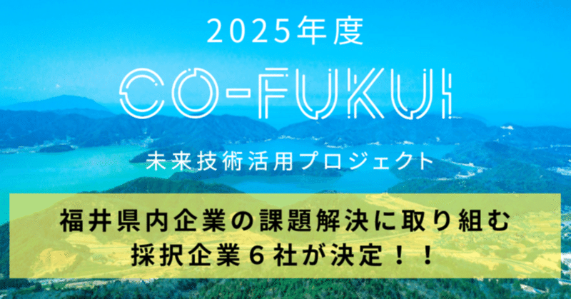 - CO-FUKUI未来技術活用プロジェクトは民間の先進技術を活かして地域課題の解決を目指す取り組みです。日本全国から選ばれた先進技術を持つスタートアップ等のサービスを活用し、実証実験を行いながら地域課題の解決を目指します。R7年度は特に福井県内で活動する企業(以下、県内企業)が抱える課題の解決に注力します。